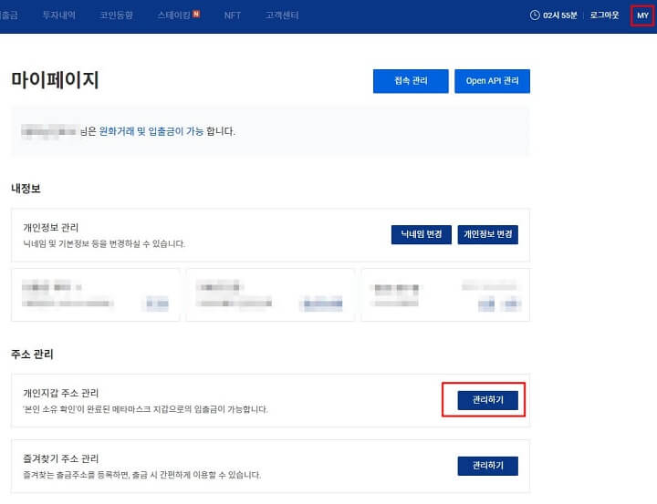 - 업비트 로그인 후 My -> 주소관리 -> 개인 지갑 주소 관리 -> 관리 하기 클릭해주세요.
