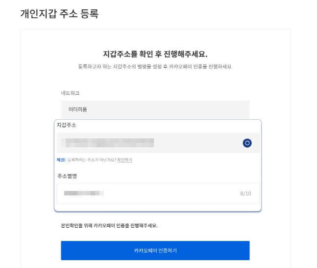 - 지갑 주소를 확인 후 별명 등록하시고 카카오페이 인증해주세요.