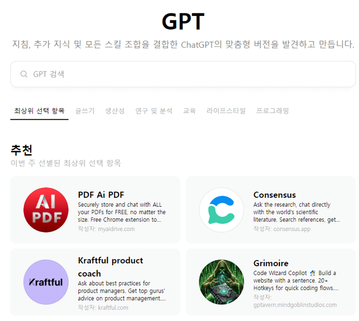 GPTS에서는 다양한 챗봇을 탐색할 수 있습니다. 카테고리별로 챗봇이 구분되어 있으며, 사용자는 필요한 챗봇을 쉽게 찾을 수 있습니다. 그림 그리기, 글쓰기, 생산성, 프로그래밍, 교육, 리서치 및 분석 등 다양한 카테고리가 있습니다. 검색창에 키워드를 입력하여 특정 챗봇을 찾을 수도 있습니다