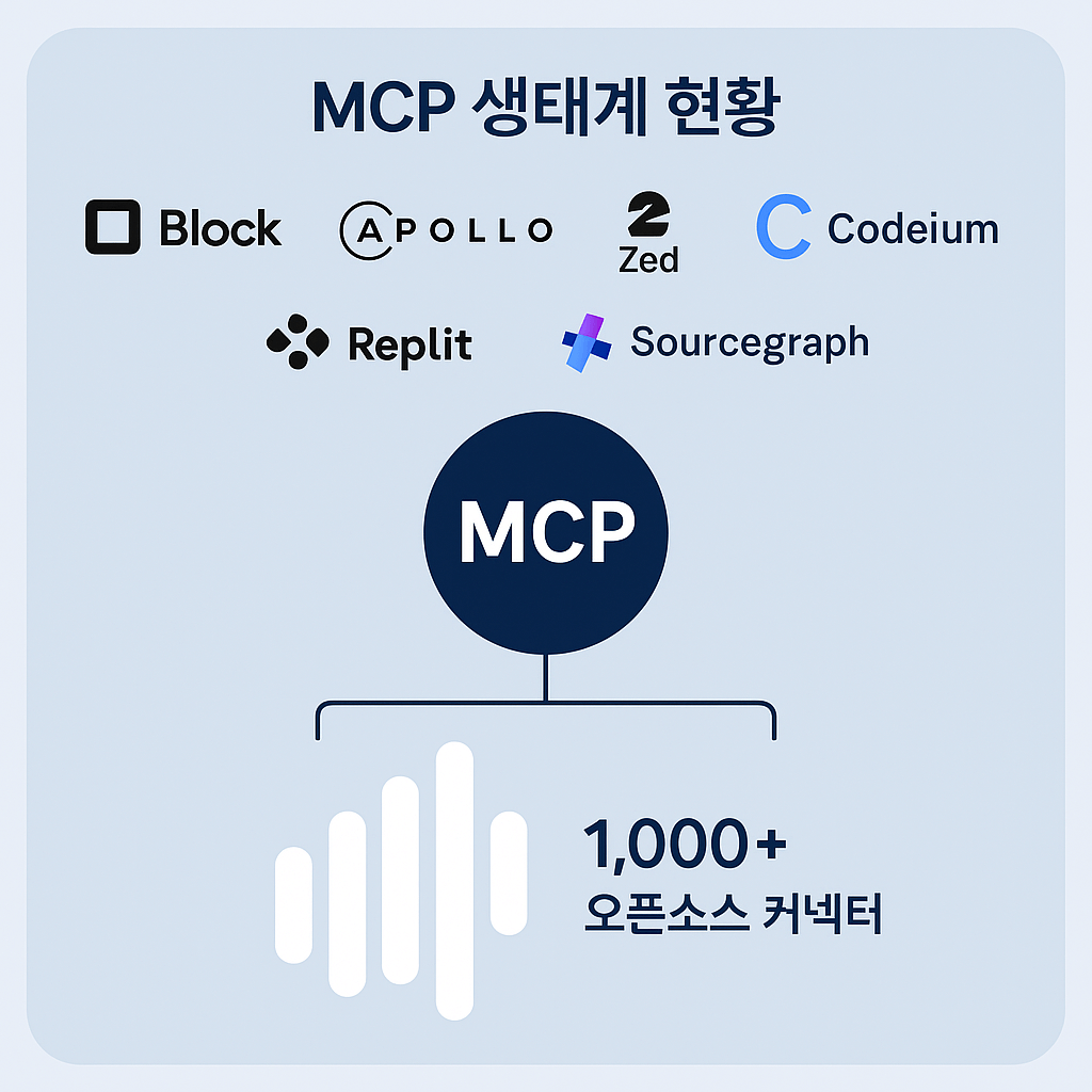 2025년 현재 Block(Square), Apollo, Zed, Replit, Codeium, Sourcegraph 등 주요 기업들이 MCP를 도입했으며, 1,000개 이상의 오픈소스 커넥터가 개발되어 생태계가 급속도로 확장되고 있습니다.