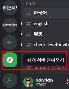 - 디스코드 왼쪽 아래 공개 서버 살펴보기를 클릭합니다.